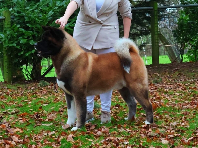 关于Gangsta,我们从哪里开始说起呢?与他的缘分好像冥冥之中是上天安排的。2022年末,我们从荷兰引进了两只类型非常出众的幼犬,其中一只便是我们现在的基础母犬Copy,而她的父亲正是Gangsta,而她的父亲正是Gangsta——当年还是青涩少年的他,已以独特气质在秀场绽放光芒。在2022年的巴黎欧洲杯上赢得了BISS,同年在荷兰,Gangsta 荣获 WoW 竞赛(Winner of Winners)冠军,并以有限参赛次数(仅参加15场犬展中的8场)荣登荷兰NO.1 美国秋田犬。在犬种样式不断退化的当下,Gangsta的类型无疑是一颗火种,我们一直都将他的样式视作繁殖的范本。直到3年后的2025年,我们与Gangsta的旅程开始有了新的转机,2024年Gangsta去了英国,他在英国Whitewreath犬舍一年的租约即将期满,在我们与多个共有人的不断协商下,最终Gangsta的繁殖者和共有人答应了Gangta的转会请求。